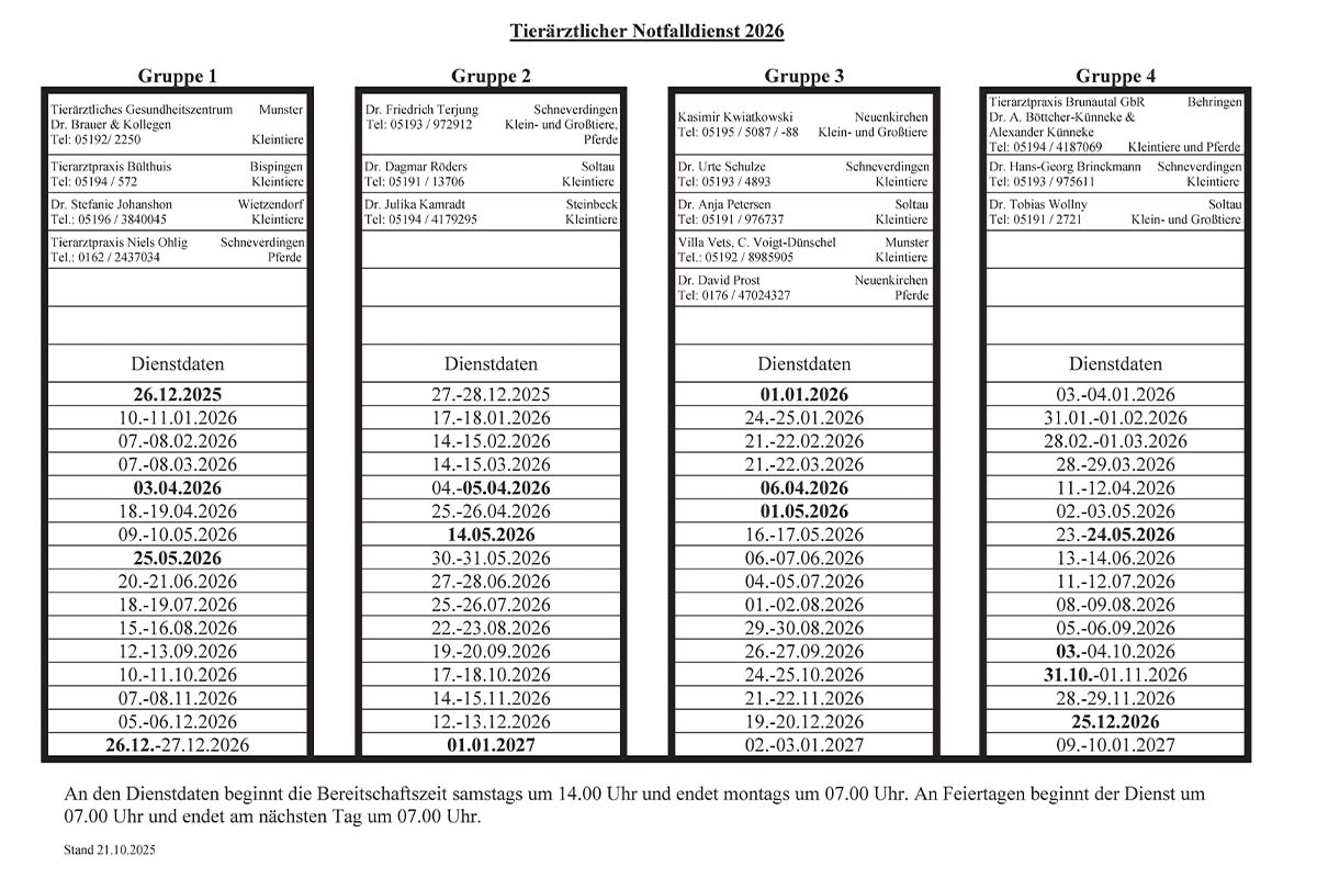 Sollten Sie doch einmal tierärztliche Hilfe in einem Notfall brauchen und uns nicht erreichen können, wenden Sie sich bitte an eine der diensthabenden Tierarztpraxen des Kreisnotdienstes. Es sind immer 3-4 Tierärzte als Notdienst eingeteilt. Unsere Praxis ist in der Notdienstgruppe 3.